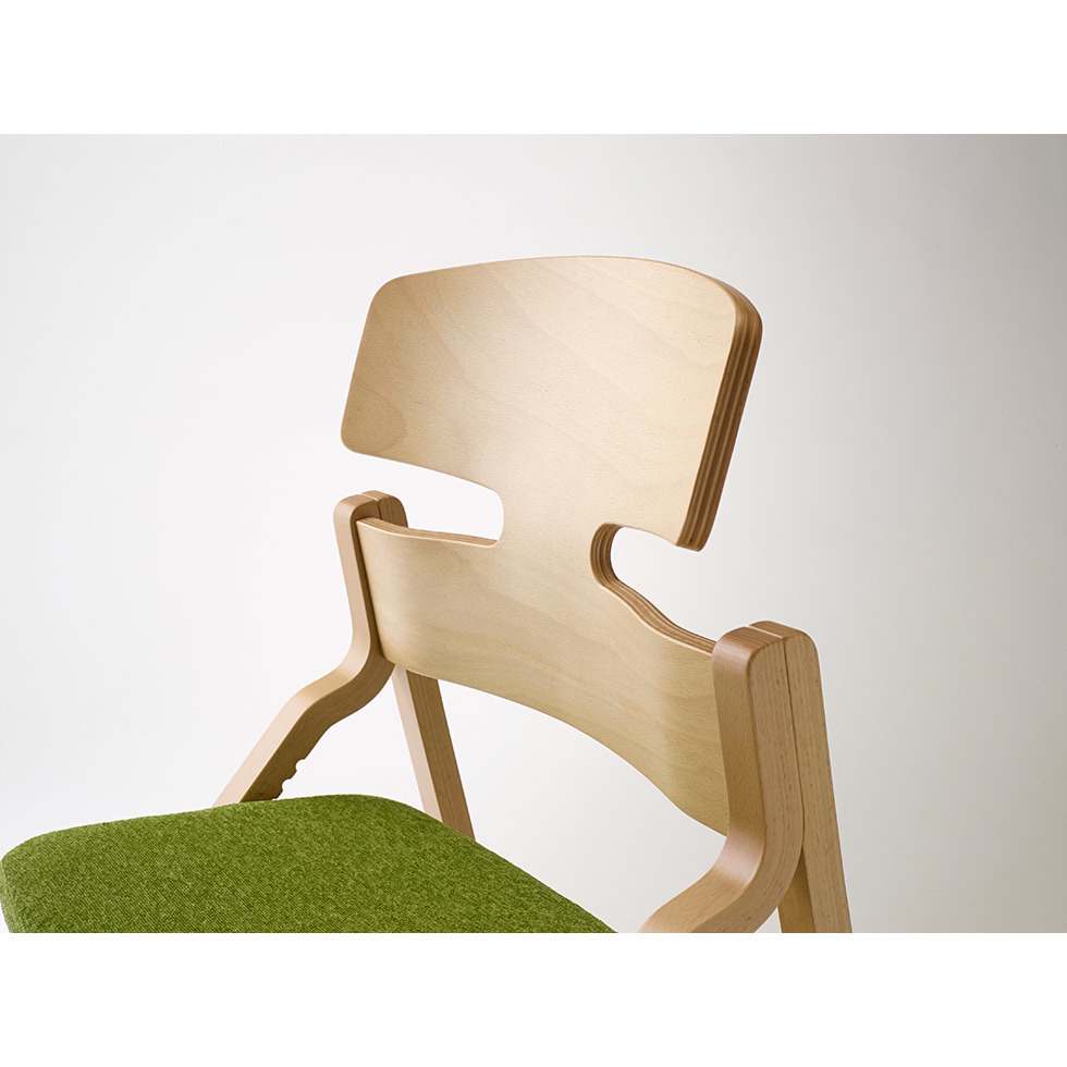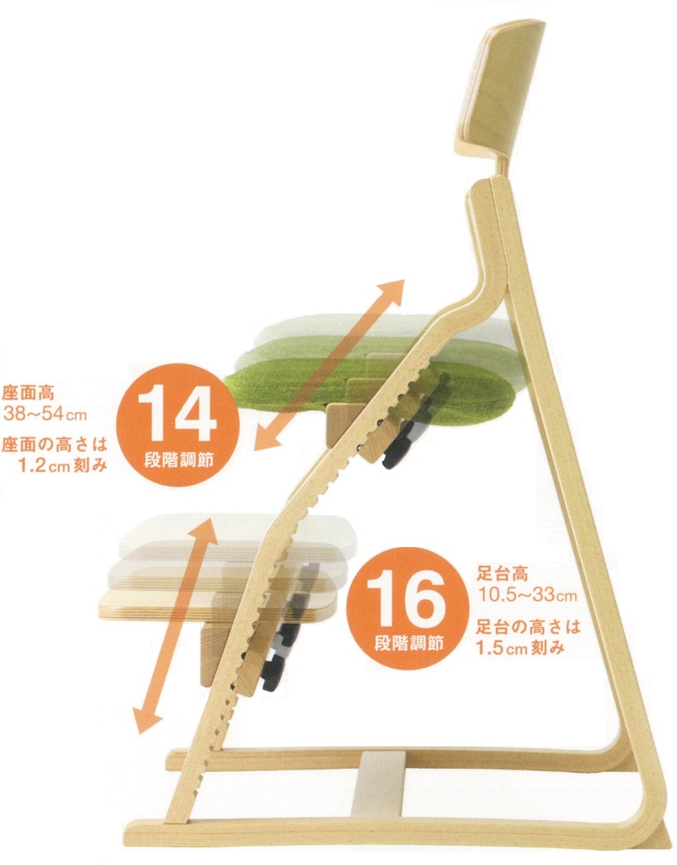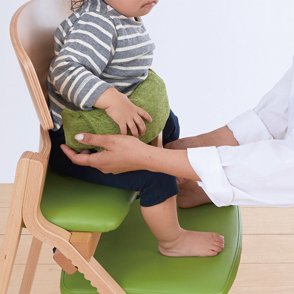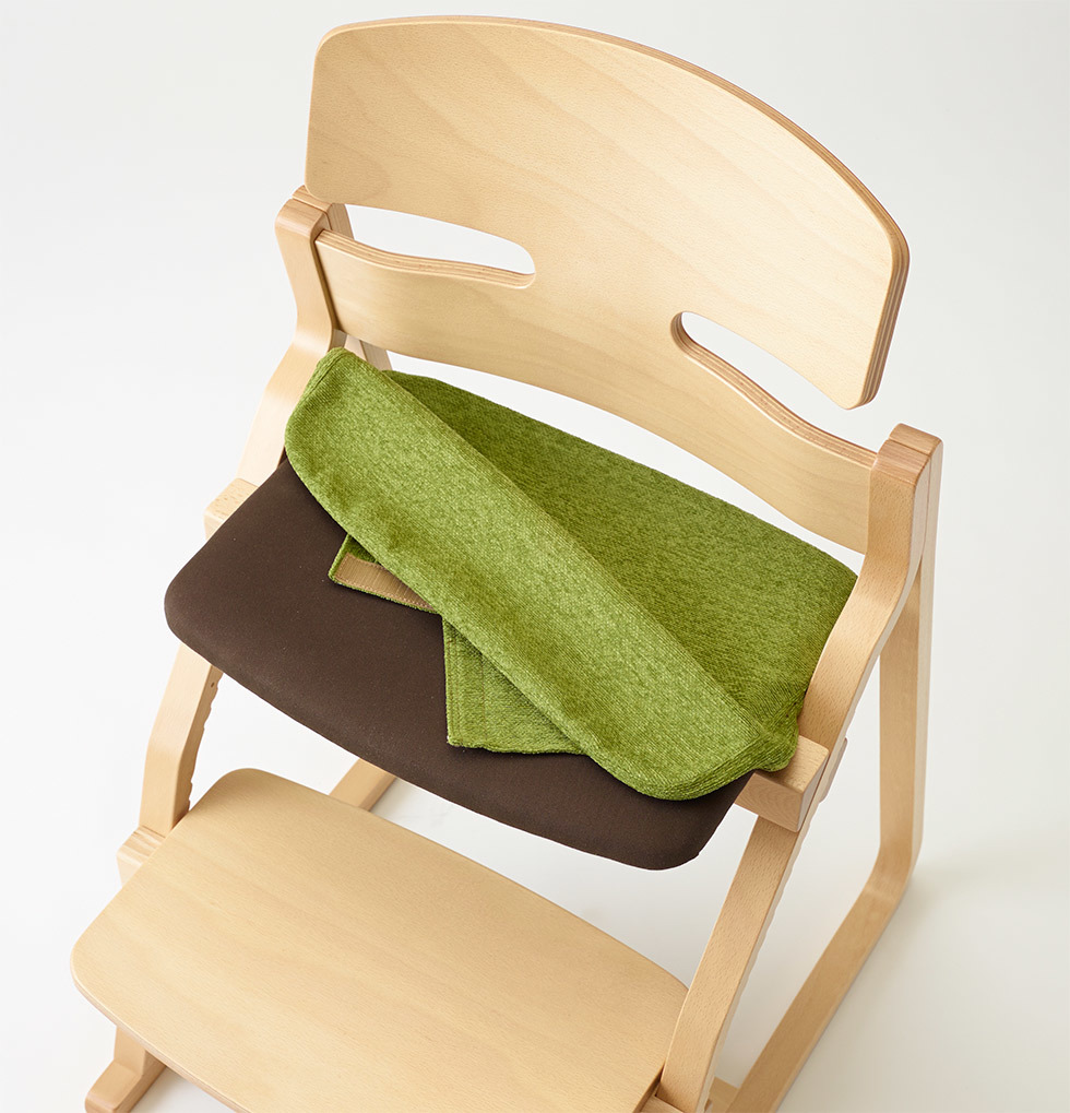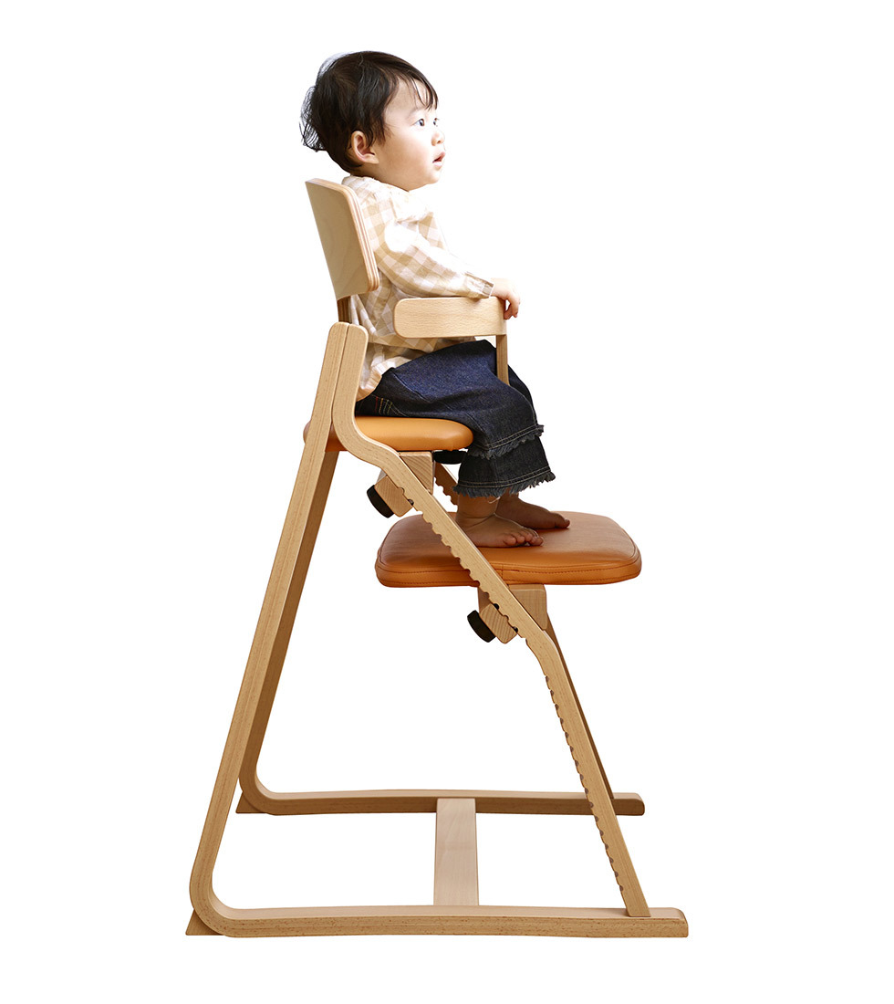 一般的なベビーチェアと違う点は、背もたれの形状と高さ調節にあります。国産の素晴らしい技術である成型合板を用いて、自然と姿勢が良くなる3次元曲線の背もたれとなっています。座面にはクッションをつけることでお尻がすべらず、安定して座り続けることができます。